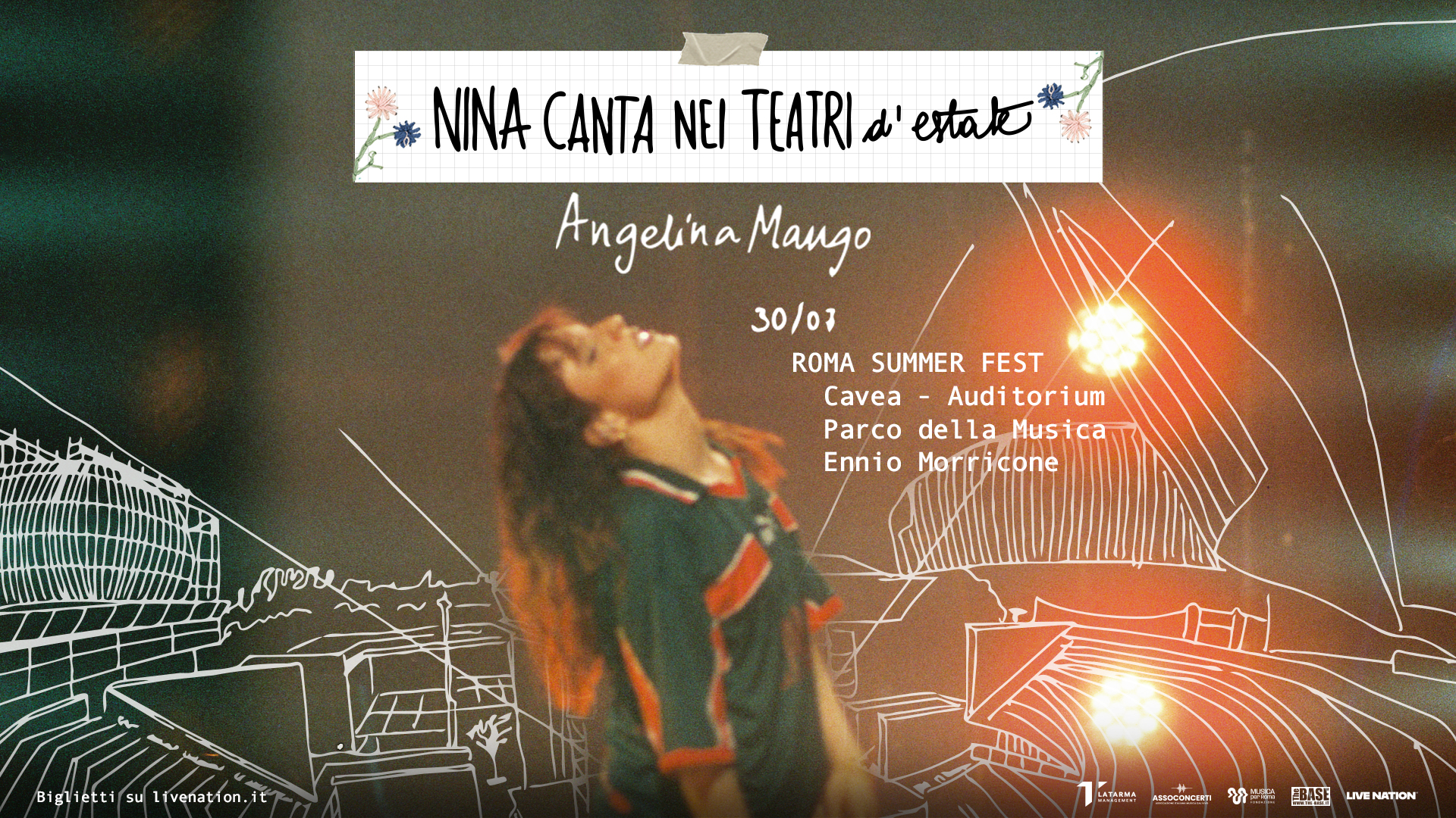 Dopo il tour nei teatri, tutto sold out in pochissimi giorni, Angelina Mango porterà nuovamente la sua musica dal vivo in estate, con un appuntamento alla Cavea dell'Auditorium Parco della Musica Ennio Morricone all'interno del Roma Summer Fest. Con Nina Canta Nei Teatri d'Estate, Angelina Mango porterà ancora una volta il pubblico a rivivere i suoi brani in un’atmosfera intima di condivisione. Lo show rappresenta la naturale estensione dell’album "Caramé": un viaggio "intimo e suonato" insieme, senza filtri, che immerge gli spettatori nel percorso creativo da cui sono nate le sue canzoni, quasi fossero idealmente seduti accanto a lei in studio o a casa. Angelina è stata affiancata da sette musicisti che l’hanno accompagnata nella riscrittura del linguaggio del pop.
