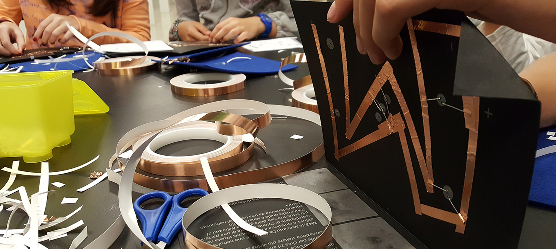 Il laboratorio si propone di avvicinare gli studenti all’elettronica, usando l’astronomia come filo conduttore per realizzare un prodotto di notevole impatto visivo: un paper circuit nel quale le stelle delle costellazioni si accendono, brillando su un cartoncino nero appositamente progettato per il laboratorio. Il paper circuit è un circuito elettrico a bassa tensione creato su un foglio di carta usando un nastro conduttivo di rame, Led e una piccola batteria a bottone.
