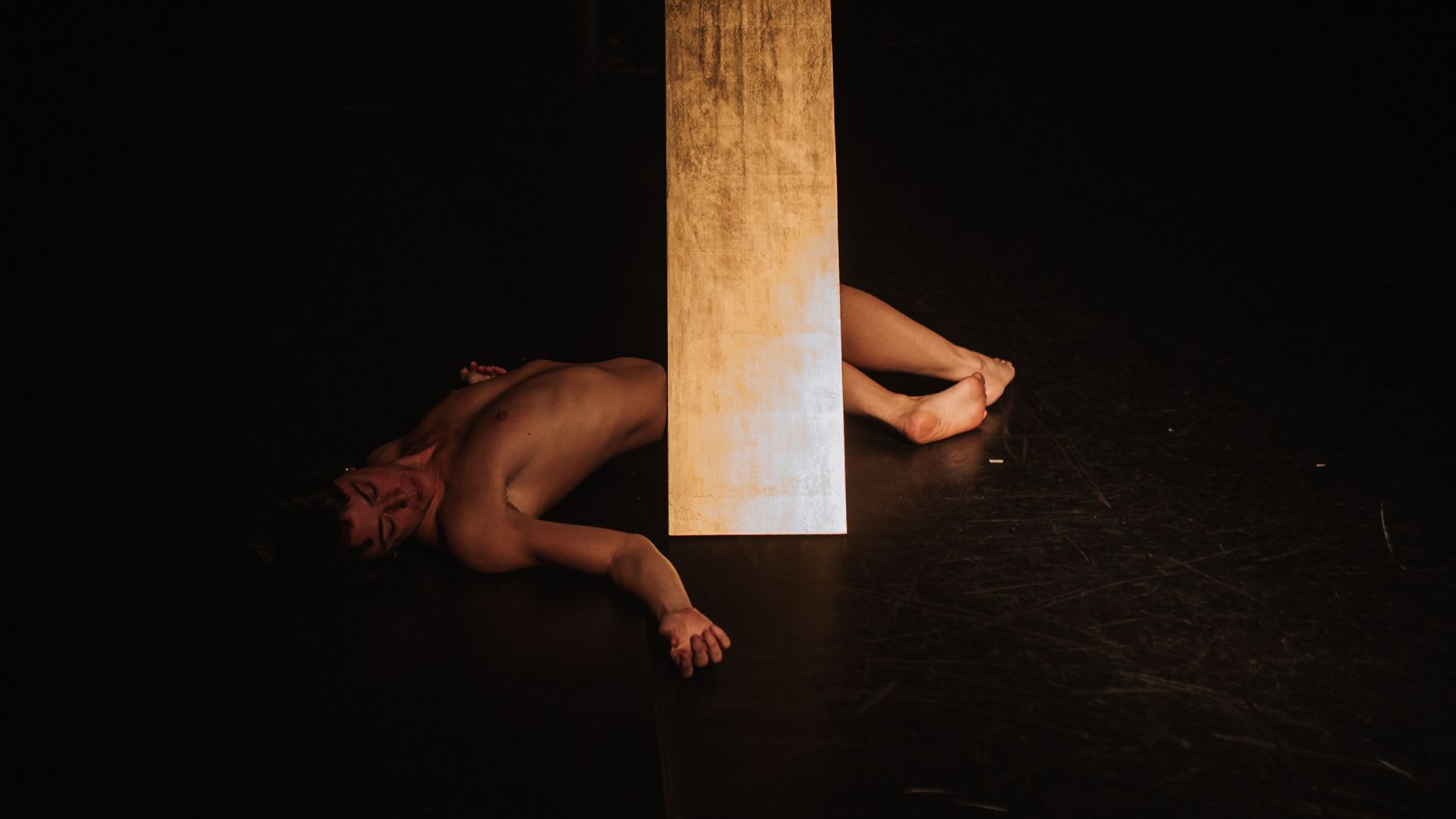 Essere abbagliati: non solo dalla luce ma dalle minime risonanze dei riflessi che dal buio collaborano alla nascita dei movimenti. In questo clima di notturno interrotto i gesti provengono dalle zone abissali del buio. Intorno ai corpi regna il vuoto e solo le misure della luce riflessa tracciano una mappa sensibile di avvicinamenti e adiacenze. L’infinito che si raggruma nello spazio minimo dei due corpi appare inesauribile.